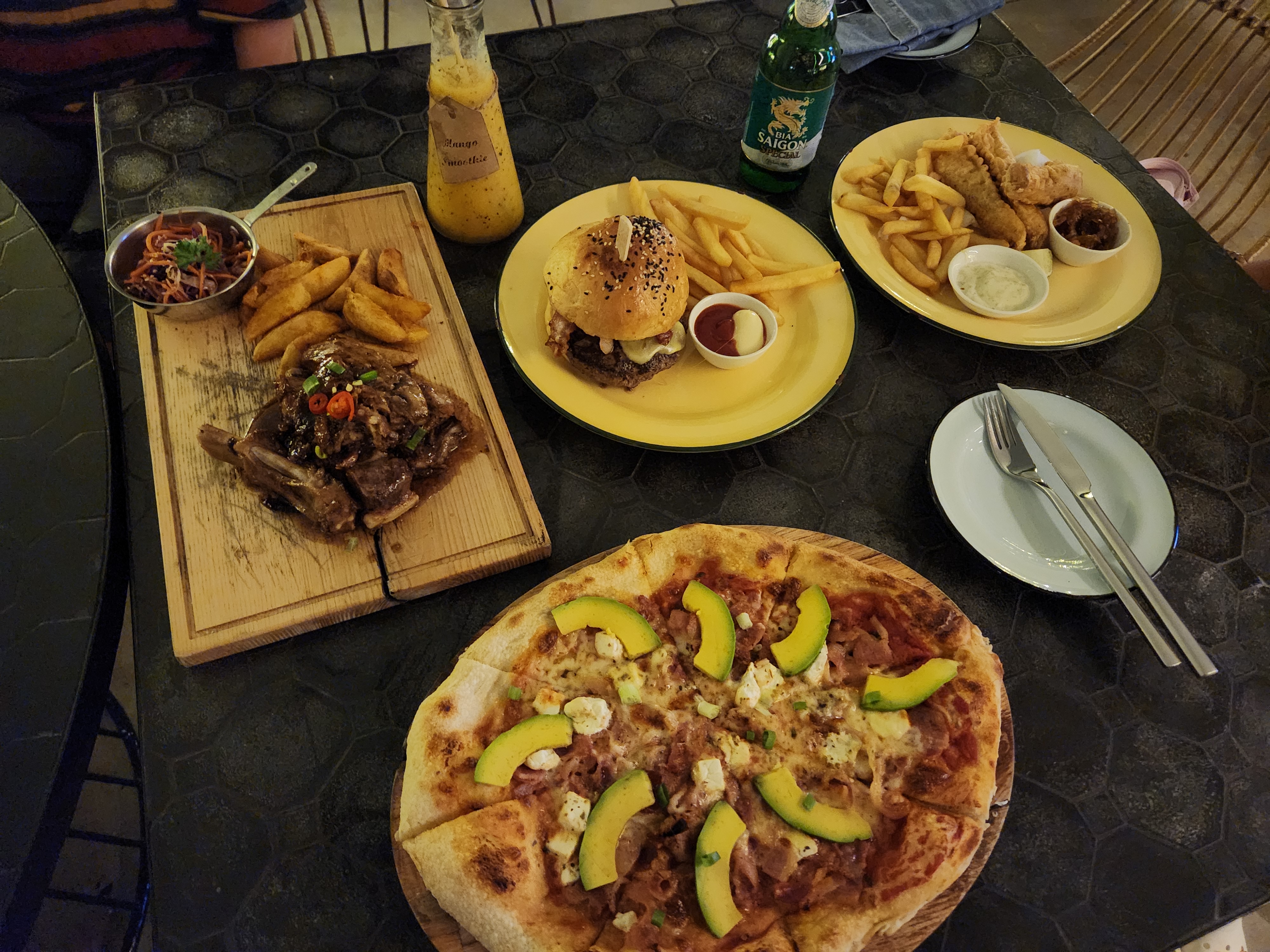 솔직히 말하면 푸꾸옥세일링클럽은 분위기는 끝내주지만 음식은 기대 이하였어요. 가격도 꽤 비싼 편이라 간단하게 피자, 햄버거, 망고주스 등을 주문해 분위기를 즐기기로 했습니다. 그래도 아이들은 햄버거는 맛있게 먹더라구요 망고쥬스는 씨가 씹혀서 호불호가가 갈릴것 같네요. 가기전에 물을 챙기는것도 추천해요.