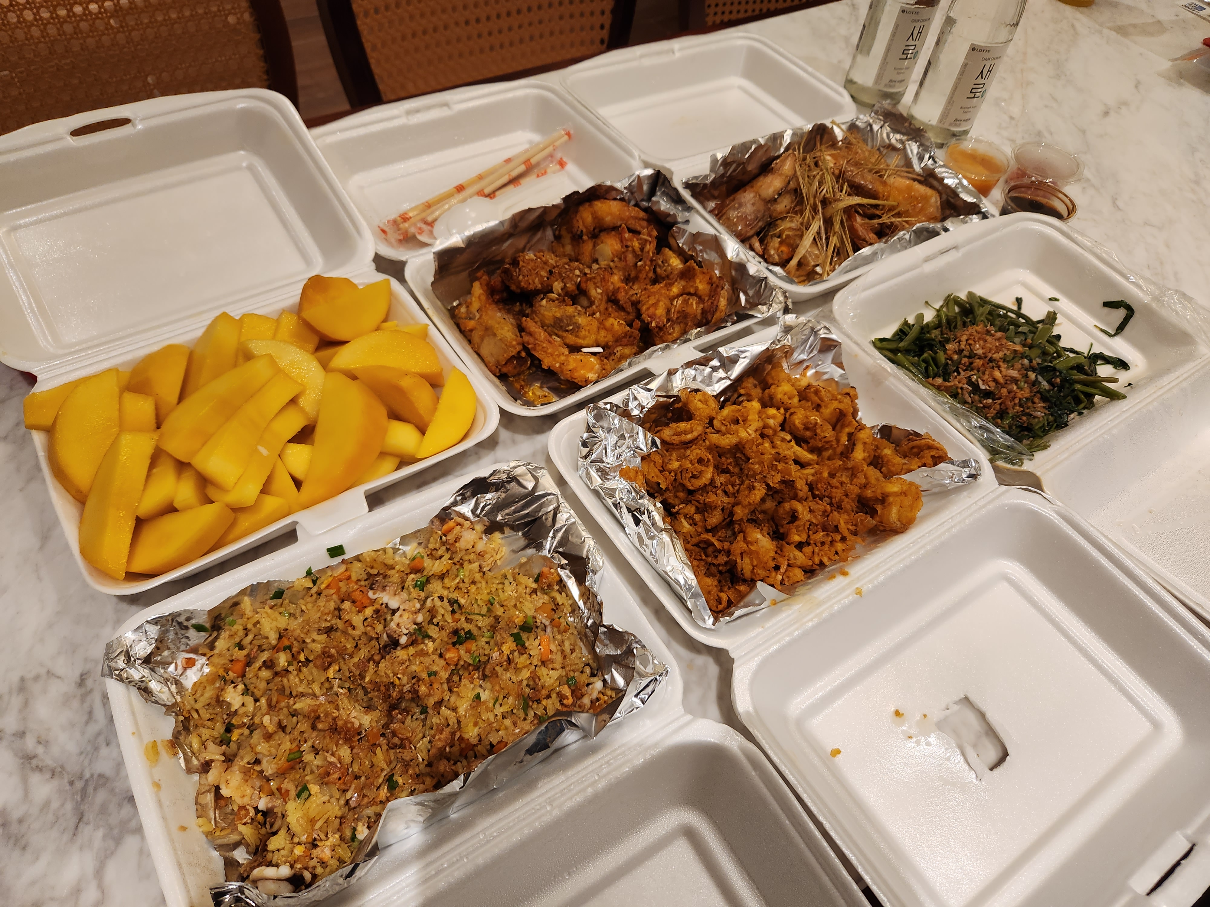 쇼가 끝난 뒤 우리는 그랩을 타고 다시 소나시야시장으로 향했어요. 이번에는 7번집에서 진짜 맛있는 베트남식 저녁을 준비했죠. 볶음밥, 모닝글로리, 버터갈릭새우, 오징어튀김을 포장하고 근처에서 망고까지 사서 숙소로 돌아왔습니다.