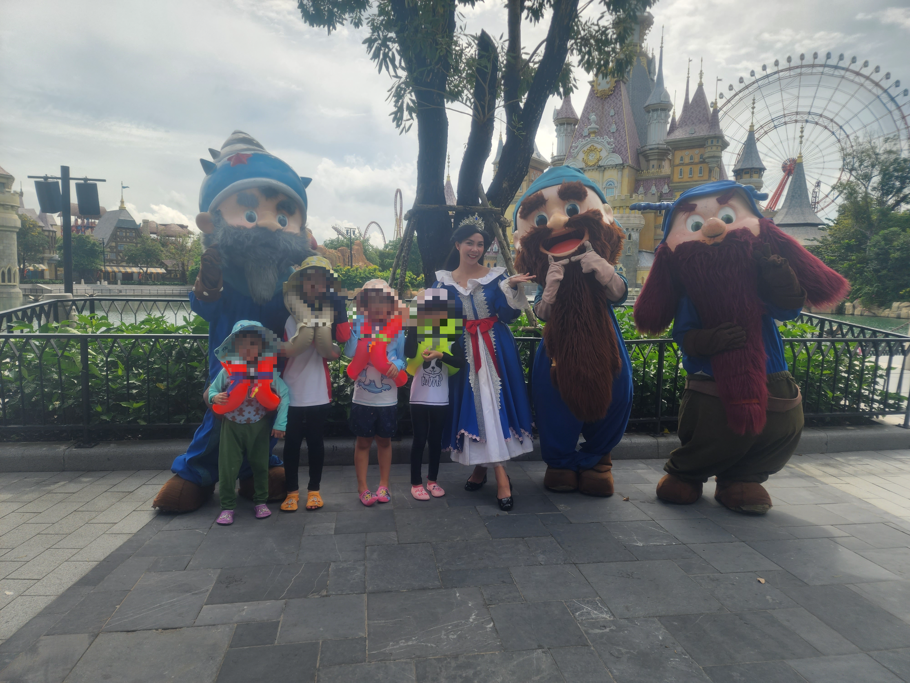 이 날은 저와 남편, 네 아이만 워터파크에 갔고, 어머님과 아가씨는 방에서 휴식을 취했어요. 리조트에서 툭툭이를 타고 로비로 이동한 뒤, 빈펄랜드로 가는 셔틀버스를 탔습니다. 거리도 아주 가까워서 금세 도착했죠. 워터파크는 오전 10시에 오픈하는데, 저희는 시간을 잘못 계산해서 너무 일찍 도착했어요.
