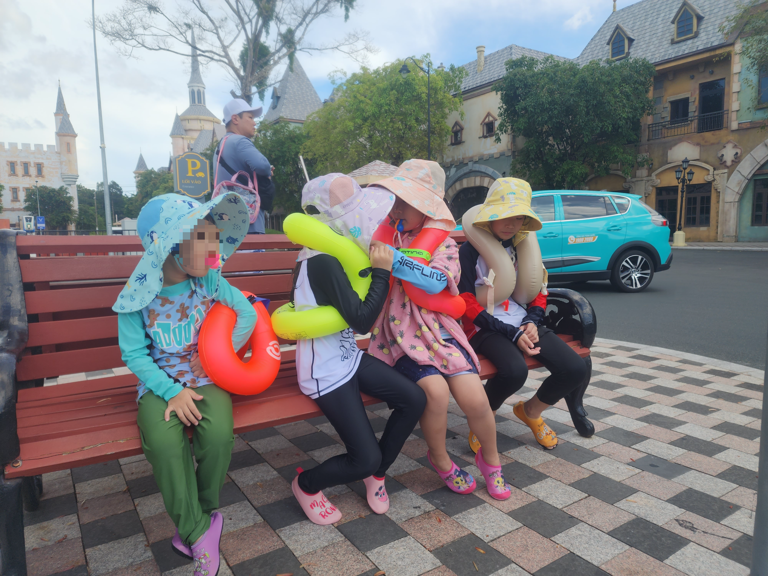 이 날은 저와 남편, 네 아이만 워터파크에 갔고, 어머님과 아가씨는 방에서 휴식을 취했어요. 리조트에서 툭툭이를 타고 로비로 이동한 뒤, 빈펄랜드로 가는 셔틀버스를 탔습니다. 거리도 아주 가까워서 금세 도착했죠. 워터파크는 오전 10시에 오픈하는데, 저희는 시간을 잘못 계산해서 너무 일찍 도착했어요.