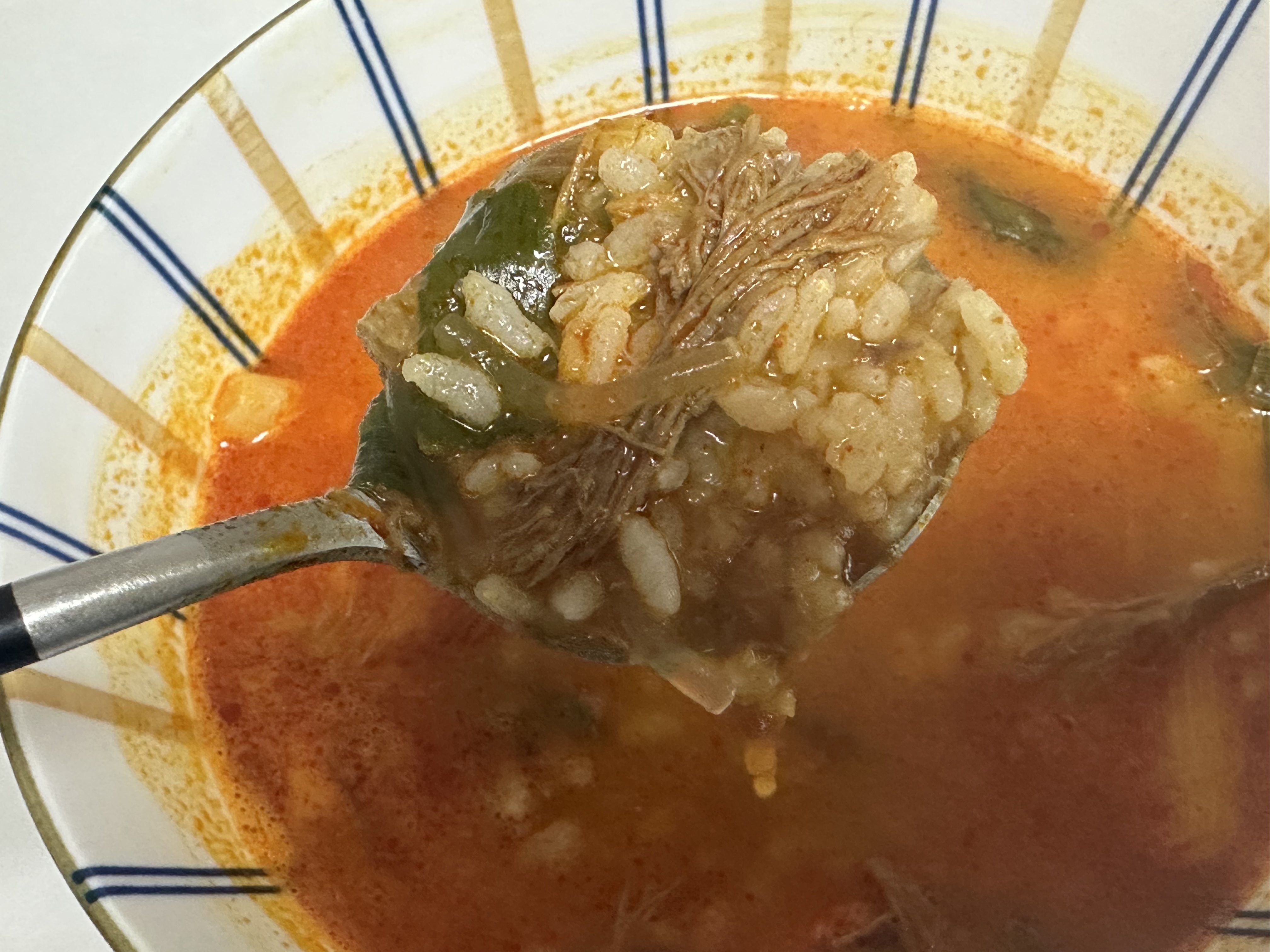 고기의 식감도 놀라웠습니다. 얇게 찢긴 고기가 냉동이었다는 게 믿기지 않을 정도로 부드럽고 풍미가 있었어요. 전 개인적으로 밥을 국에 말아 먹는 스타일이라, 국밥처럼 즐겼는데 그야말로 꿀맛이었습니다. 간도 딱 맞아서 따로 간을 조절할 필요도 없었습니다.